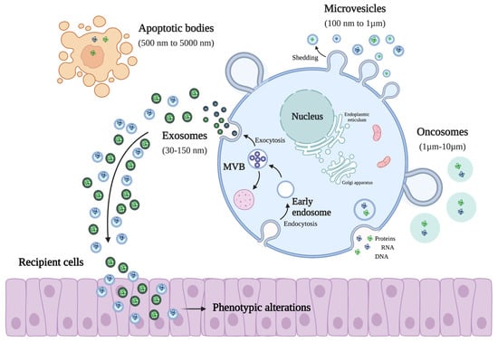 EVs consist of an umbrella term that define cell-released membrane vesicles, and it includes different subtypes [,]. Presently, the guidelines of the International Society for Extracellular Vesicles (ISEV) define four main subclasses, exosomes, microvesicles, oncosomes, and apoptotic bodies, depending on their biogenesis, size, and protein markers expressed in the plasma membrane (Figure 1) []. Exosomes are the smallest of the EVs subtypes and comprise those with sizes ranging between 30 and 100 nm []. This class is formed from late endosomes, which are produced by the inward budding of the limited multivesicular body (MVB) membrane []. Subsequently, the invagination of late endosomal membranes leads to the formation of intraluminal vesicles (ILVs) within large MVBs []. During the process, some biomolecules are fused into the invaginating membrane, while the cytosolic components are engulfed and enclosed within the ILVs [,]. Then, most of the ILVs are released into the extracellular space upon incorporation with the plasma membrane, which are then referred to as exosomes [,]. Microvesicles, with sizes ranging from 100 nm to 1 µm, represent a group formed by the outward budding of the producing cell plasmatic membrane []. Oncosomes, also referred to as large oncosomes (LOs), comprise sizes ranging between 1 and 10 µm and are a class of tumor-derived microvesicles that can spread oncogenic material to other cells and tissues in the tumor microenvironment [,,]. Lastly, apoptotic bodies, with sizes ranging between 50 nm and 5000 nm in diameter, are released by dying cells into the extracellular space []. Concerning protein markers, exosomes express transmembrane proteins such as CD9, CD63, and CD81 and other proteins related to the plasma membrane [,]. The microvesicles mainly include cytosolic- and plasma membrane-associated proteins, namely the tetraspanins and proteins such as heat shock proteins, cytoskeletal proteins, and proteins containing post-translational modifications [,,]. Finally, the apoptotic bodies express higher expression levels of proteins associated with the nucleus, such as heat shock protein 60 (HSP60), the endoplasmic reticulum (GRP78), histones, and the Golgi apparatus [,,].