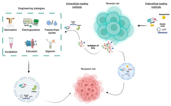 Engineered methods for loading therapeutic agents into EVs. Endogenous cargo incorporation methods modify the EV-producing cells to incorporate therapeutic agents into the EVs through the natural EV biogenesis pathways. On the other hand, exogenous cargo can be loaded into EVs using loading methods such as sonication, electroporation, freeze/thaw cycles, co-incubation, extrusion, or saponin (created with Bio-Render).
