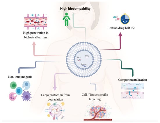 Recently, endogenous nanoscale membrane vesicles have received attention because they present characteristics such as a micro/nanostructure and bioactive composition, which could answer some of the limitations mentioned for the traditional delivery systems []. Furthermore, EVs have been presented to contain an intelligent core, allowing them to respond to endogenous and/or exogenous signals, target sites of disease, and provide treatment feedback for best function in patients [,]. These developments represent a new way for next-generation nanomedicine and offer new opportunities for drug delivery systems.