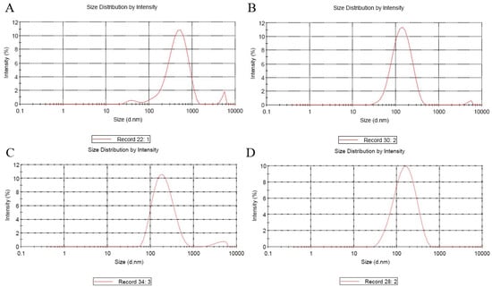 The map of entrapped VTPIL-7 nanoparticles size. (A) VTPIL-7-CS; (B) VTPIL-7-PEI; (C) VTPIL-7-CS-PEG-Lac; (D) VTPIL-7-CS-PEI-PEG.