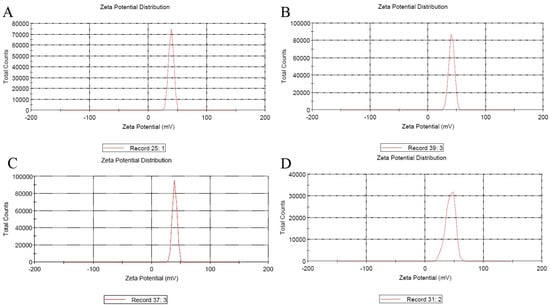 The map of entrapped VTPIL-7 nanoparticles Zeta Potential (mV). (A) VTPIL-7-CS; (B) VTPIL-7-PEI; (C) VTPIL-7-CS-PEG-Lac; (D) VTPIL-7-CS-PEI-PEG.