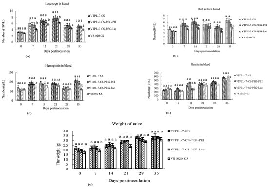 The changes of leukocytes (a), erythrocytes (b), platelets (c), and hemoglobin (d) in the peripheral blood and weight (e) of VTPIL-7-CS, VTPIL-7-CS-PEG-PEI and VTPIL-7-CS-PEG-Lac treated mice and control groups. Statistical significance was shown by letter symbols. Different letters above the bars of the groups indicate significant differences at p < 0.05. The same letters notated above the bars indicate that the differences among the groups were not significant.