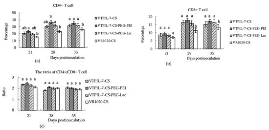 The variation of CD4+ and CD8+ T cells and their ratio in peripheral blood of mice treated with VTPIL-7-CS, VTPIL-7-CS-PEG-PEI, VTPIL-7-CS-PEG-Lac, and plasmid controls. (a) CD4+ T cell level (%); (b) CD8+ T cell level (%); (c) The ratio of CD4+/CD8+ T cell. Statistical significance was shown by letter symbols. Different letters above the bars of the groups indicate significant differences at p < 0.05. The same letters notated above the bars indicate that the differences among the groups were not significant.