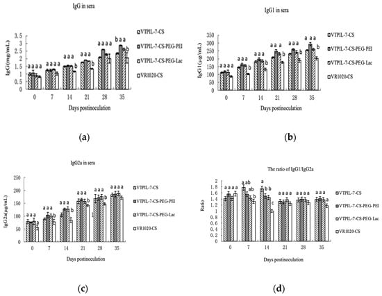 The IgG1, IgG2a, IgG, and their ratio in the sera of mice inoculated with VTPIL-7-CS, VTPIL-7-CS-PEG-PEI, VTPIL-7-CS-PEG-Lac, and plasmid controls was quantified by ELISA. (a) IgG level; (b) IgG1 level; (c) IgG2a level; (d) The ratio of IgG1/IgG2a. Statistical significance was shown by letter symbols. Different letters above the bars of the groups indicate significant differences at p < 0.05. The same letters notated above the bars indicate that the differences among the groups were not significant.