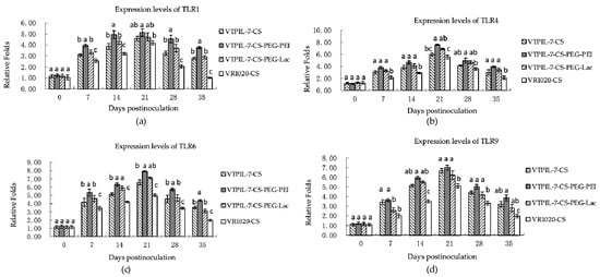 Figure 8a–d showed that in comparison with the control mice, the expression levels of the TLR1, 4, 6 and 9 genes increased markedly in the treated mice from 7 to 35 days (p < 0.05). TLR6 showed a strong promotion effect, which was six times higher before inoculation. The CS-PEG-PEI mice manifested a stronger enhancement effect on TLRs expression than other treated mice (Figure 8a–d).