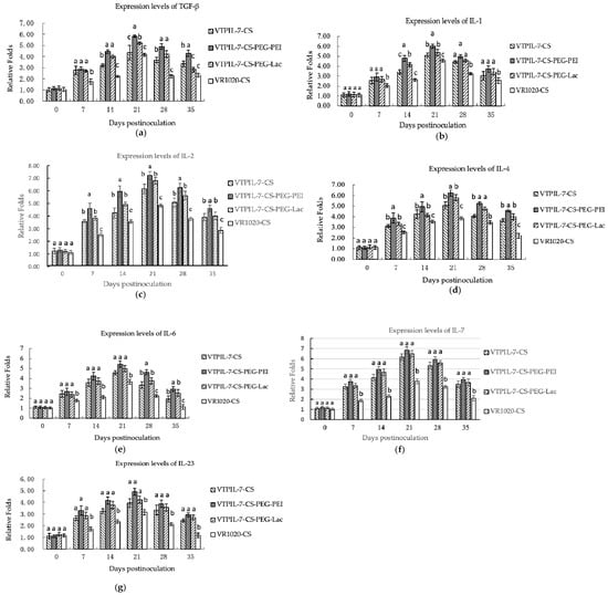 The expression levels of immunoregulatory cytokines at the gene level in inoculated mice analyzed by RT-qPCR. (a) TGF-β expression level; (b) IL-1 expression levels; (c) IL-2 expression level; (d) IL-4 expression level; (e) IL-6 expression level; (f) IL-7 expression level; (g) IL-23 expression level. Statistical significance was shown by letter displays. Different letters above the bars indicate significant differences at p < 0.05. The same letters notated above the bars indicate that the differences were not significant.