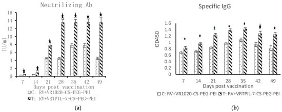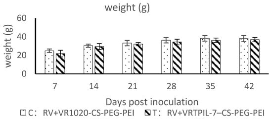 In this experiment, 20 healthy female Kunming mice (16–18 g) at 6 weeks of age were obtained from the Laboratory animal center of Sichuan University and randomly divided into 2 groups: control group (C) and treatment group (T). The mice were intraperitoneally immunized as follows: C group: 7 IU Human diploid cell inactivated Rabies virus vaccine (RABV) from Chengdu Kanghua Biological Products Co., Ltd., Chengdu, China + 100.0 µg CS-PEI-PEG/VR1020; T group: 100.0 µg CS-PEI-PEG/VTPIL-7 + 7 IU RABV vaccine. Booster immunization was carried out using the same method on the 14th day after the first immunization. Blood samples (100 µL) were collected weekly from the tail veins of mice for 49 days. The mice were reared under the same condition. The animal experiment was approved by the Animal Ethics Committee (ACE) of the Animal Experiment Center of Sichuan University (SYXK-Chuan-2021-172).