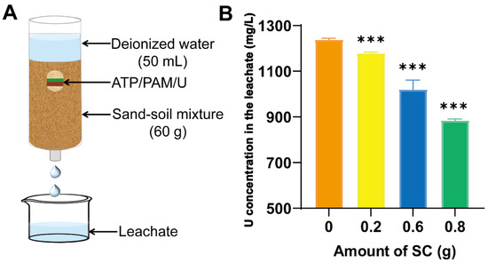 Leaching assay. (A) Schematic diagram of the leaching system. (B) Influence of the amount of SC on the leaching loss of urea from soil. Notes: ATP: attapulgite; PAM: polyacrylamide; U: urea. Asterisks indicate statistically significant differences, as determined by Student’s t-test (*** p < 0.001).