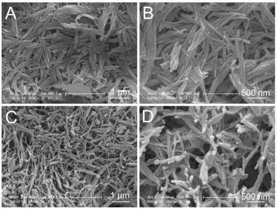 The microstructure of the SC as revealed by SEM with different magnifications: (A,B) attapulgite; (C,D) SC.
