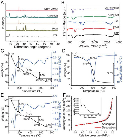 Interaction analyses of the SC system. (A) FTIR spectra of attapulgite. (B) XRD patterns of attapulgite, polyacrylamide, and SC. (C–E) TGA (black line) and DTA (blue line) curves of attapulgite, polyacrylamide, and SC. (F) N2 adsorption–desorption isotherms of SC. (Inset) Pore size distribution of SC. Notes: ATP: attapulgite; PAM: polyacrylamide; U: urea; FTIR: Fourier transform infrared spectrometer; XRD: X-ray diffractometer; TGA: thermal gravimetric analysis; DTA: differential thermal analysis.