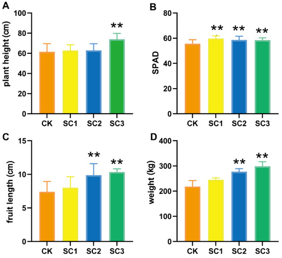 Effects of SC on plant growth. (A–D) Plant height, SPAD, and fruit length and weight when treated with different amounts of SC. Asterisks indicate statistically significant differences, as determined by Student’s t-test (** p < 0.01).