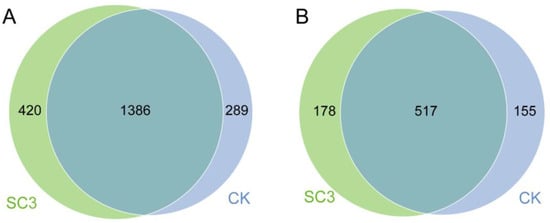 The OTUs between CK and SC3, displayed in a Venn diagram. (A) Bacteria, (B) fungi. The overlapping part shows the common OTU numbers.