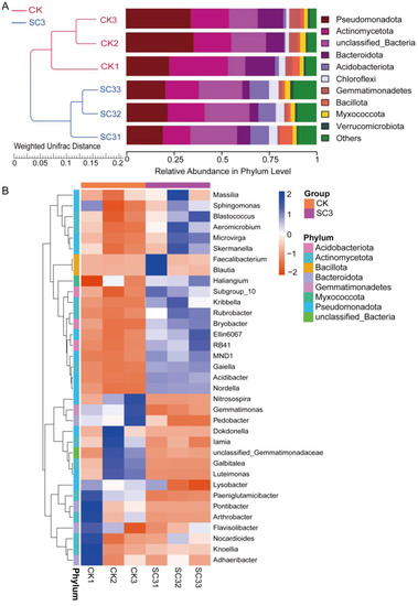 Principal coordinate analysis (PCoA) was performed to reveal the variation in the bacterial communities among the different samples (Figure S4A). The PCoA significantly separated the CK samples from the SC3 samples, indicating that the two treatments had their own specific characteristic microbial community. The heat map of beta diversity also indicated that the microbial communities of the samples were clearly different between CK and SC3 (Figure S4B). Both the PCoA and heatmap results showed samples that were similar in their bacterial compositions in each treatment. The bacterial compositions of the samples in the CK were different from those in SC3. The results were also the same as the results of the UPGMA analysis (Figure 6A).