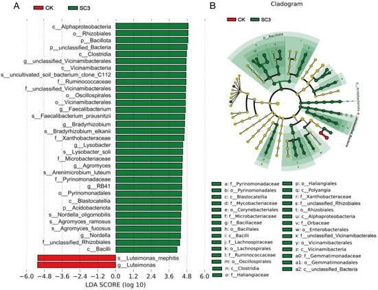 LEfSe analysis of the difference in bacterial abundance between CK and SC3. (A) LDA score between CK and SC3. The column length indicates the effect size of the bacterial lineages. (B) The cladogram of bacterial communities with differences between CK and SC3. The proportion of bacterial abundance is indicated by the circle’s diameter. Red and green nodes: bacterial taxa that play a vital role in CK and SC3, respectively. Yellow: nonsignificant.