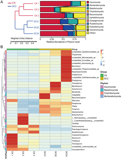Composition and relative abundance of fungal communities. (A) UPGMA clustering analysis: the top 10 relative abundance levels in each sample at the phylum level. (B) Clustering heat map of the relative abundance of the top 35 fungi at the genus level in each sample. The corresponding value of the heat map is the “Z” value, depicted by the color intensity, ranging from 2 to −2. The gradient of color shifts from blue (low abundance) to red (high abundance). CK1-CK3 represent the 3 replicates of soil without soil conditioner; SC31-SC33 represent the 3 replicates of soil with 400 kg ha−1 soil conditioner.