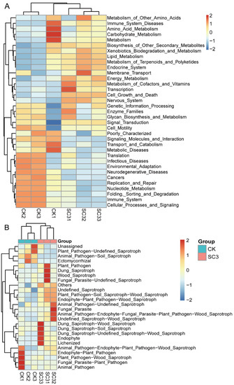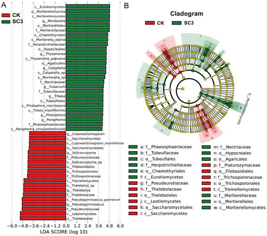 LEfSe was conducted to identify the taxa with significant differences between CK and SC3 (Figure 9). The results showed that there were 46 fungal taxa with distinguishable differences with LDA values greater than 4.0 (Figure 9A). From the LEfSe analysis, one phylum, two classes, five orders, five families, seven genera, and seven species were enriched in SC3, while three classes, four orders, four families, four genera, and four species were enriched in CK. These results indicated that fungal compositions in soil are influenced by the use of SC3.