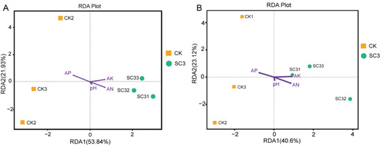 Redundancy analysis (RDA) of microbial genera and soil physical and chemical properties. (A,B) RDA of bacterial and fungal communities and environmental variables. The arrow length in the RDA plot corresponds to the strength of the correlation between a variable and the community structure. CK1-CK3 represent the 3 replicates of soil without soil conditioner; SC31-SC33 represent the 3 replicates of soil with 400 kg ha−1 soil conditioner.