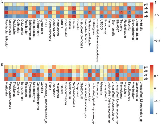 Spearman correlation analysis was used to study the correlations between environmental variables and the microbial abundance in genera (Figure 11). In terms of bacterial abundance (Figure 11A), Massilia and Blautia were positively correlated with AN, while Pontibacter and Paeniglutamicibacter were negatively correlated. Truepera, Flaviaesturariibacter, Gemmatimonas, Arthrobacter, and Paeniglutamicibacter were positively correlated with AP, while Massilia and Blautia had negative correlations. Kribbella, Aeromicrobium, Massilia, and Blautia were positively correlated with AK, but Truepera, UTBCD1, and Paeniglutamicibacter were negatively correlated with AK. In terms of fungal abundance (Figure 11B), Myrothecium, Acremonium, and Mortierella were positively correlated with AN, but unclassified_Leotiomycetes_sp., Trichosporon, Leucosporidium, and Cutaneotrichosporon were negatively correlated. Unclassified_Leotiomycetes_sp., Leucosporidium, Solicoccozyma, and Thelebolus were positively correlated with AP, while Titaea had a negative correlation. Myrothecium, Acremonium, and Titaea were positively correlated with AK, but unclassified_Leotiomycetes_sp. and Leucosporidium had negative correlations with AK.