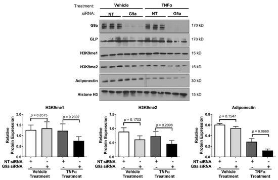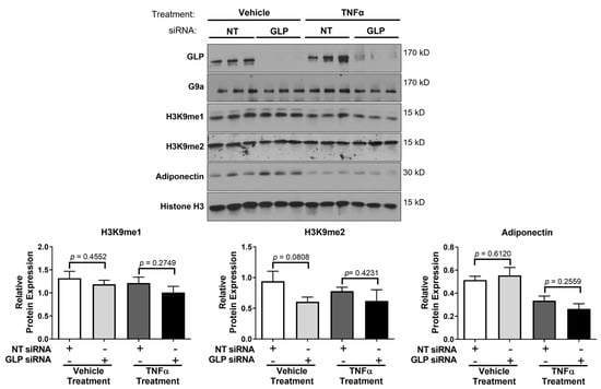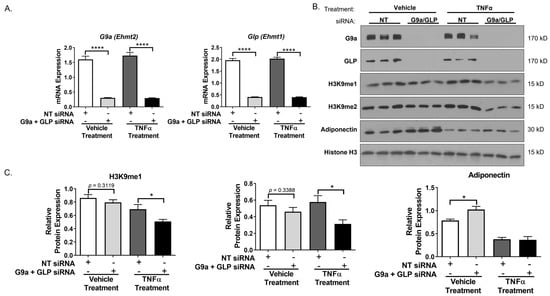 In mice, G9a and GLP expression in adipocytes contributes to metabolic health, and loss of expression of either one of these methyltransferases is associated with systemic metabolic dysfunction [13,16]. Hence, we hypothesized that the loss of G9a or GLP would have cell-autonomous effects in cultured mature adipocytes. We performed siRNA experiments to knockdown either G9a or GLP in murine 3T3-L1 adipocytes to determine if the expression of either protein impacted H3K9 methylation and/or TNFα-regulated gene expression. As shown in Figure 1, we effectively knocked down the protein expression of G9a without significantly modulating GLP levels. In addition, we knocked down GLP protein expression without significantly affecting the protein expression of G9a (Figure 2).