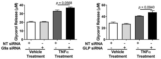 TNFα is a potent inducer of lipolysis and has been shown to increase basal lipolysis in adipocytes isolated from human subcutaneous adipose tissue (SAT) [33]. However, the underlying mechanism of TNFα-induced lipolysis remains unknown. It typically takes greater than six hours to detect TNFα-induced changes in lipolysis in 3T3-L1 adipocytes, which suggests that this regulation is largely mediated by genomic effects. Experiments performed in human adipocytes demonstrated that the NF-κB signaling pathway is important for the lipolytic response to TNFα [55]. As shown in Figure 7, the loss of G9a and GLP increases TNFα-induced lipolysis suggesting that the loss of G9a and GLP in adipocytes may contribute to the metabolically unhealthy phenotype observed in G9a and GLP adipocyte-specific knockout mice [13,16]. Enhanced lipolysis increases the circulating levels of glycerol/free fatty acids—a clinical manifestation that is considered harmful and is typically associated with metabolically unhealthy obesity and insulin resistance [56]. Additionally, elevated free fatty acids in circulation can lead to ectopic storage in skeletal muscle and the liver [57]. Our results show an increase in glycerol and free fatty acid release from TNFα-stimulated G9a/GLP-deficient adipocytes that occurs in a cell-autonomous manner and suggest that G9a and GLP play a role in restricting TNFα’s ability to induce lipolysis. Since TNFα affects the expression of proteins known to regulate lipolysis [58], we examined if G9a/GLP knockdown had an effect on the gene or protein expression of ATGL, HSL, and PLIN. As previously documented, TNFα robustly reduced the mRNA expression of Atgl, Hsl, and Plin1 [32,33]. Interestingly, adipocytes with reduced levels of G9a and GLP had increased Atgl, Hsl, and Plin1 mRNA expression independent of TNFα treatment (Figure 8). However, this effect did not translate into similar changes in protein expression suggesting that TNFα-induced lipolysis is not due to the increased expression of these three fundamental prolipolytic proteins. Further studies are needed to determine the specific mechanism of G9a and GLP’s ability to regulate TNFα-induced lipolysis.