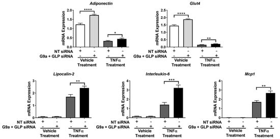 Since we observed that the knockdown of either G9a or GLP did not have prominent effects on adipocytes, we used siRNA to simultaneously knockdown both G9a and GLP protein expression in 3T3-L1 adipocytes. As shown in Figure 5, we knocked down G9a and Glp mRNA and protein expression. As observed with single knockdowns (Figure 1 and Figure 2), the siRNA-mediated knockdown of both G9a and GLP protein levels did not have a significant effect on the mono- and di-methylation of H3K9 under basal conditions. However, adipocytes lacking both G9a and GLP and treated with TNFα had a decrease in the mono- and di-methylation of H3K9 expression (Figure 5B,C). In basal conditions, there was an increase in adiponectin protein expression in G9a/GLP-knockdown adipocytes, but the TNFα suppression of adiponectin expression was not changed in adipocytes lacking these two methyltransferases. The levels of histone H3 were examined to demonstrate the even loading of protein samples and that the observed changes in histone methylation were not due to alterations in protein levels (Figure 5B). Interestingly, qPCR analysis revealed that knocking down both G9a and GLP in fully differentiated adipocytes increased Adiponectin and Glut4 mRNA expression under basal conditions (top portion of Figure 6). In double-knockdown adipocytes, TNFα resulted in the expected decrease in Adiponectin and Glut4 mRNA expression, and these effects were largely unaffected by the double knockdown. Notably, the loss of G9a and GLP expression did not affect the basal levels of Lcn2, Il6, and Mcp1 mRNA expression in adipocytes but did enhance the ability of TNFα to stimulate the expression of these proinflammatory genes (bottom portion of Figure 6).