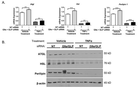 Although TNFα increases lipolysis, it has also been shown to reduce expression of mRNA or proteins that promote lipolysis, such as adipose triglyceride lipase (ATGL), hormone sensitive lipase (HSL), and perilipin 1 (PLIN1) [32,33]. We examined the mRNA and protein expression of these lipolytic mediators and observed that the loss of both G9a and GLP increases Atgl, Hsl, and Plin1 mRNA expression under basal and TNFα-stimulated conditions, but this does not result in increased protein levels (Figure 8). TNFα treatment substantially reduced the expression of ATGL, HSL, and PLIN1 protein levels, but there were no significant changes between G9a/GLP-knockdown adipocytes and control adipocytes (Figure 8).
