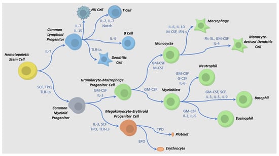 - Pixley, F.J.; Stanley, E.R. Cytokines and Cytokine Receptors Regulating Cell Survival, Proliferation, and Differentiation in Hematopoiesis. In Handbook of Cell Signaling, 2nd ed.; Academic Press: Cambridge, MA, USA, 2010; Volume 3. [Google Scholar]