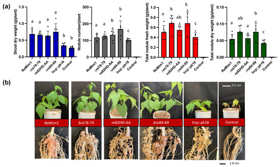 Symbiotic phenotype of Phaseolus vulgaris cv. Negro Jamapa 28 dpi with ReMim1 and T6SS mutants. (a) Quantitative data from dry weight of plants and nodules. Values are averages of at least six plants from four independent replicates. Each point represents the average of 4 biological replicates. Bars with the same letter are not significantly different using a Student’s t-test (p < 0.05). (b) Shoot, roots, and nodules’ representatives. Scale bars are 3.6 cm and 1 cm, respectively.