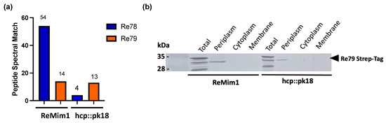 To identify Re79 in ReMim1, the re79 gene was amplified using PCR with a primer with a sequence extension to obtain Re79 with a C-terminal Strep-tag (Table S2). The amplicon was cloned in a PCR2.1 TOPO plasmid. The insert was then extracted using NdeI restriction enzyme and cloned in pLMB509 plasmid. E. coli S17.1 was transformed with plasmid pLMB509-Re79StrepTag and conjugated to ReMim1 and hcp::pk18 strains according to 2.2.1. item. All the primers used are listed in Supplementary Table S2. All the constructs were confirmed using Sanger sequencing.