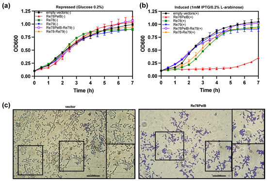 The data suggest that re78/79 could code for a toxin and immunity protein, respectively, that would act in the periplasmic space. To corroborate this hypothesis, we studied the effect of the expression in E. coli of Re78 and Re79 proteins using plasmids pET22b and pBAD33, respectively. The growth of E. coli capable of expressing two variants of Re78, one with a N-terminal PelB (Re78PelB) to be directed to the periplasm or without PelB (Re78), and Re79 were compared under induction or repression conditions (Figure 5a,b). The growth of E. coli capable of expressing two variants of Re78, one with a N-terminal PelB (Re78PelB) or without PelB (Re78), and Re79 were also compared. Figure 5b shows that, under induction conditions, only the strain expressing Re78PelB had no growth. The rest of the strains, including the control strain (with plasmid pET22b and pBAD33), grew relatively well, although those expressing Re78 and Re78–Re79 were delayed 1–2 h compared to the others. These results indicate that Re78 inhibits growth when it has a signal peptide and that this effect is neutralized by the coexpression of cognate immunity protein Re79. In addition, the microscopic examination was performed three hours after the induction of cells expressing Re78PelB and a control with plasmid pET22b (Figure 5c). It is difficult to quantify the difference between the images obtained in these two cases, but it appears as though there could be more aggregation of cells in the case of E. coli expressing Re78PelB, as seen in the insets.