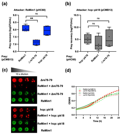To assess whether Re78/Re79 contribute to intrabacterial competition in vitro, a co-incubation assay of the ReMim1 strain and the Δre78–79 strain was performed. The assay showed a significant reduction in the number of cells in the mutant strain in the presence of the wt strain that did not occur when the hcp::pk18 strain and wt were coincubated (Figure 6a). There was also no reduction when the hcp mutant was incubated with Δre78–79 (Figure 6b). Similarly, when the growth of the hcp::pk18 or Δre78–79 was compared in the presence of the wt strain using serial decimal dilutions, similar results were obtained, that is, the survival of Δre78–79 was lower and this effect did not occur with the hcp mutant co-incubation (Figure 6c). Figure 6d shows that there is no difference in the growth of wt and Δre78–79.