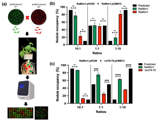 Effect of re78–79 gene deletion on nodule occupancy competition. (a) Experiment workflow for the competition assay among labeled strains with plasmids pHC60 (Tcr) and pCMB13 (Spr) able to express fluorescence proteins GFP (green nodules) and (red nodules), DsRED, respectively. Approximately 60–100 nodules per plant were removed at 28 dpi. The identities of the strains from the nodules were ascertained using fluorescence and by growth in YMB medium with the different antibiotics. (b) Nodule occupancy test to demonstrate that the presence of plasmids does not affect competitiveness. (c) Nodule occupancy after coinoculation with ReMim1 (pHC60) and Δre78–79 (pCMB13) strains at different ratios. Assays were performed in duplicate with two biological replicates. The asterisk denotes significance according to Fisher´s test (****) p < 0.0001, (***) p < 0.001, (*) p < 0.05 and “ns” indicates no statistically significant difference (p > 0.05).