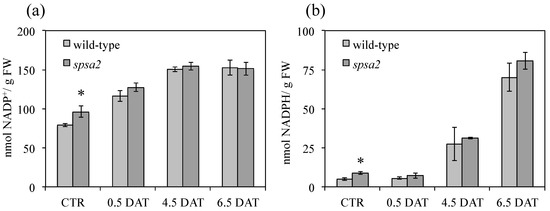 3.8. Comparison of the NADP+:NADPH Ratio in spsa2 and Wild-Type Plants
