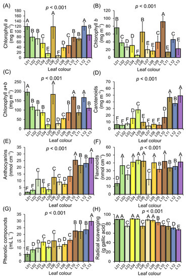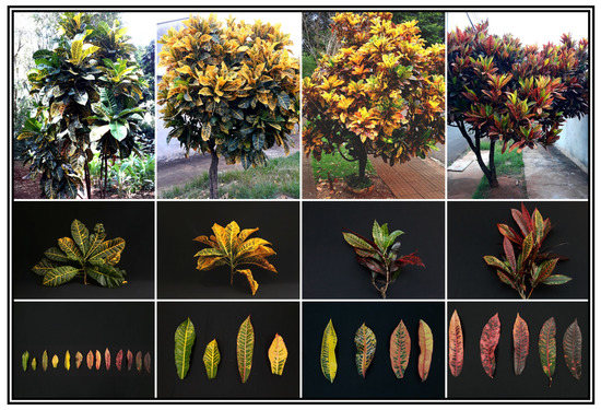- Mollick, A.S.; Shimoji, H.; Denda, T.; Yokota, M.; Yamasaki, H. Croton Codiaeum variegatum (L.) Blume Cultivars Characterized by Leaf Phenotypic Parameters. Sci. Hortic. 2011, 132, 71–79. [Google Scholar] [CrossRef]