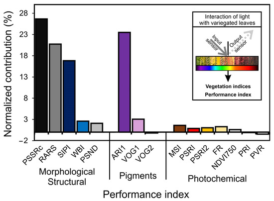 3.5. Vegetation Indexes and Putative Contribution for Biophysical, Biochemical, and Photochemical Parameters for Variegated Leaves