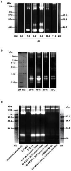 Gelatin zymography was conducted according to the method of Wang et al. [22], with slight modification using 10% separating gel and 5% stacking gel. The sea cucumber intestinal extract solution was mixed with sample buffer at a ratio of 1:4 (v/v). The sample buffer was composed of 250 mM Tris-HCl (pH 6.8), 5% SDS, 0.05% bromophenol blue, and 50% glycerol. Then, the mixtures (16 μL) were electrophoresed in SDS-PAGE containing 1 mg/mL gelatin at 4 °C. The electrophoresed gels were washed twice with 2.5% (v/v) Triton X-100 for 30 min each to remove SDS and then rinsed with deionized water. Subsequently, the gels were incubated at the set temperature for 24 h in Tris-HCl buffers at different pH values containing 5 mM CaCl2. The temperature was set at 30, 40, 50, and 60 °C, and the pH was set from 6.0 to 11.0, respectively. Finally, the gels were stained with Coomassie bright blue R-250 for 4 h and distained with 30% methanol and 10% acetic acid for 1 h. To explore the effect of inhibitors, the final concentrations of the inhibitors were set as 6 mM PMSF, 6 mM 1,10-phenanthroline and 60 μM E-64, respectively. The mixture of the diluted intestinal extracts and inhibitor solutions was prepared before mixing with sample buffer.