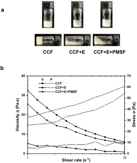 Effects of sea cucumber intestinal extracts on the appearance and rheological properties of sea cucumber crude collagen fibers. (a) The apparent morphology of CCF, CCF+E, CCF+E+PMSF. (b) Viscosity and stress of samples at different shear rates. CCF: crude collagen fibers; E: sea cucumber intestinal extracts; PMSF: phenylmethylsulfonyl fluoride.