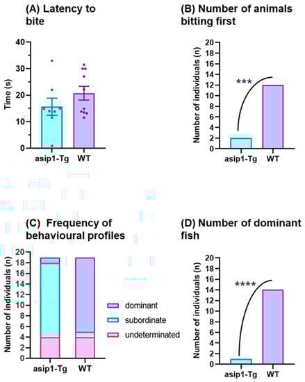 During the experimental period of this study, two phases were easily differentiated. The initial phase consisted of mutual assessment behaviours, with fish circling and biting each other in order to determine the relative fighting ability of the opponent. Such a phase started with the first interaction of the trial and ended when the first chase/retreat was observed, thus marking the resolution point of the fight. Since the bite is the most frequent behaviour, representing over 50% of all behaviour types exhibited by zebrafish in the first phase. It was decided to measure which genotype bites, it was found that WT significantly bit first (p = 0.0019) (Figure 1A), although there were no significant differences in latency to the first territory intrusion (p = 0.2291) (Figure 1B). During the second phase, which is characterised by chasing and retreating until the subordinate fish typically falls into a freeze-type behaviour, asip1-Tg fish fled when chased by WT animals, consequently remaining immobile in one corner at the bottom of the tank (freezing behaviour). Approximately 74% (14 out of 20) of asip1-Tg fish exhibited the aforementioned behaviour during dyadic fights. Transgenic fish only exhibited dominant behaviour in one of the experimental conflicts, and four dyadic pairs showed no apparent agonistic behaviour (Figure 1C). The results show an evident subordinate personality in asip1-Tg (p < 0.0001) (Figure 1D).