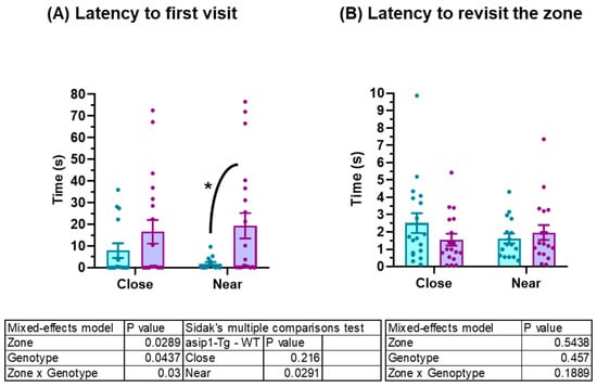 Behavioural differences between asip1-Tg and WT in the mirror–image stimulus test. (A) Latency to both first approximation (close area) and exploration (near area); (B) Latency to repeat approximation and exploration behaviours. Experiments were performed on 20 WT and 20 asip1-Tg fish. Data are represented as mean ± SEM and analysed by two-way ANOVA repeated measures (RM), followed by Sidak’s multiple comparison test. Blue and purple colours represent asip1-Tg and WT fish, respectively. Asterisks indicate statistical differences between genotypes (p ≤ 0.05).