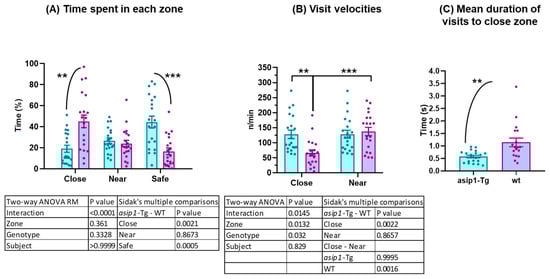 Transgenic fish spent significantly less time close to the mirror and more time in the safe area (Figure 3A). Surprisingly, the visits’ velocity, e.g., entries per minute spent in an area, was significantly higher close to the mirror in asip1-Tg than in WT fish (Figure 3B). Despite this, WT animals spent double the time close to the mirror in each visit compared to transgenic fish (asip1-Tg mean = 0.571 s, WT mean = 1.143 s; p = 0.0022) (Figure 3C). Significant differences in visits’ velocity between zones close to and near the mirror were only found in the WT group (p = 0.0016) (Figure 3B). Taken together, these results suggest a significant difference in fighting behaviour between genotypes. While asip1-Tg preferred the safe area, WT fish confronted their specular image for longer periods of time close to the mirror, contrary to transgenic animals, which approach the mirror with a higher frequency but for a shorter period of time.