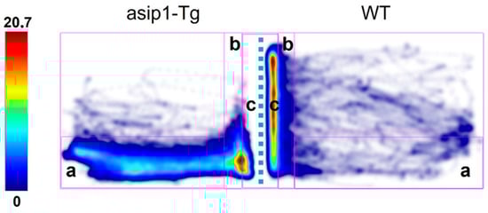 Representative heatmaps of asip1-Tg (left) and WT (right). The colour scale represents the cumulative time spent in each of the previously defined arena zones. (a) a safe area consisting of the bottom part of the tank; (b) near the mirror zone, an exploration area where fish can approach but not touch the mirror; and (c) a close to the mirror area where direct contact of the fish with the mirror can take place. The dotted line represents the position of the mirror.