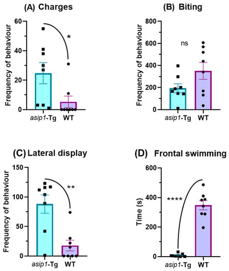 Frequency and duration of aggressive-related behaviours of asip1-Tg and WT in the mirror-stimulus test. (A) Charges; (B) biting; (C) lateral display; (D) frontal swimming. Data relate to 8 WT and 8 asip1-Tg fish and are represented as mean ± SEM. Data were analysed by an unpaired t-test. Asterisks indicate statistical differences between genotypes (* p ≤ 0.05, ** p ≤ 0.01, **** p ≤ 0.0001). ns indicates non-significant differences.