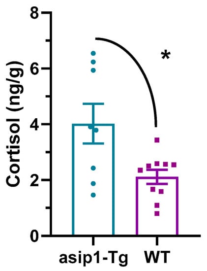 Whole-body cortisol basal levels in both genotypes were determined by EIA assays. It was observed that asip1-Tg zebrafish exhibited significantly higher total cortisol levels than WT animals (p = 0.0146) (Figure 6).