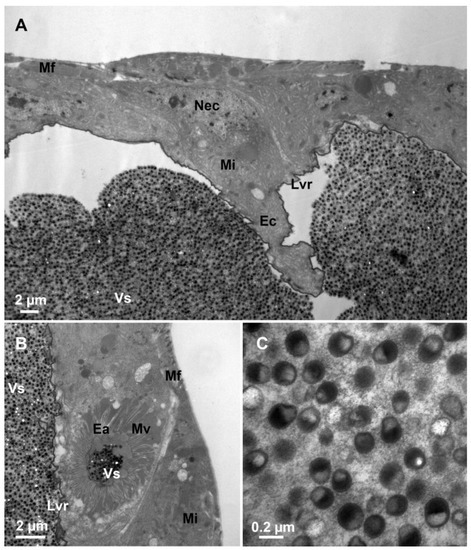 - Heavner, M.E.; Ramroop, J.; Gueguen, G.; Ramrattan, G.; Dolios, G.; Scarpati, M.; Kwiat, J.; Bhattacharya, S.; Wang, R.; Singh, S.; et al. Novel organelles with elements of bacterial and eukaryotic secretion systems weaponize parasites of Drosophila. Curr. Biol. 2017, 27, 2869–2877. [Google Scholar] [CrossRef] [PubMed]