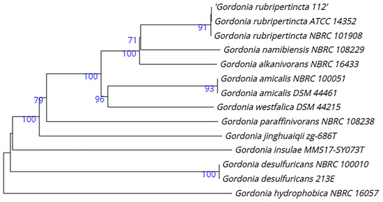 Thus, strain 112 reliably belongs to G. rubripertincta. Its closest relative is the Gordonia rubripertincta type strain ATCC14352.