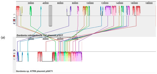 Contigs 15 and 17 of strain 112 were identified as plasmid elements with a total length of 189,570 nucleotides (plasmid p1517). Plasmid p1517 is most related to plasmid pGKT1 of Gordonia sp. KTR9 (NC_018582.1) (Figure 2a). No significant kinship was observed with the plasmids of G. rubripertincta SD5 and CWB2 strains (Figure 2b).