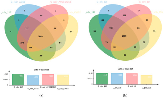 Venn diagram depicting pangenome of (a) Gordonia rubripertincta strains 112, ATCC14352, CWB2 and W3S5, (b) G. rubripertincta 112, G. amicalis 1D, G. alkanivorans 135, and G. polyisoprenivorans 135.
