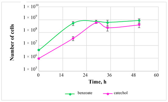 The cell number during growth on catechol reaches a maximum after 24 h of growth, after which the culture enters the stationary phase (Figure 5).