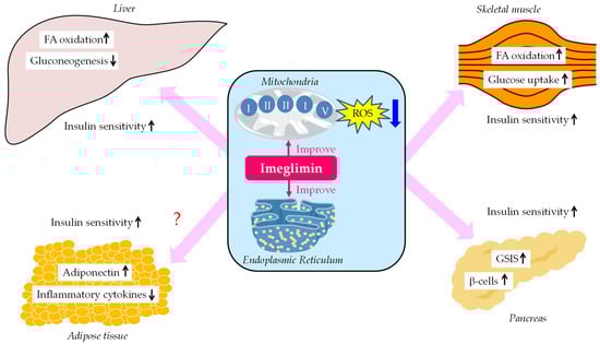 The summary of glucose-lowering mechanisms of imeglimin was shown in Figure 1. Imeglimin improves mitochondrial function, which ameliorates insulin sensitivity in liver and skeletal muscle. As a result, FA oxidation increases in liver and skeletal muscle, hepatic glucose production decreases, and glucose uptake increases in skeletal muscle. Furthermore, imgelimin improves mitochondrial and ER function, which increases GSIS and β-cell mass. Such improvements in insulin sensitivity in metabolically active organs may improve systemic insulin resistance, which may change the insulin resistance milieu in adipose tissue in patients with type 2 diabetes, such as via an increase in adiponectin and a decrease in inflammatory cytokines.