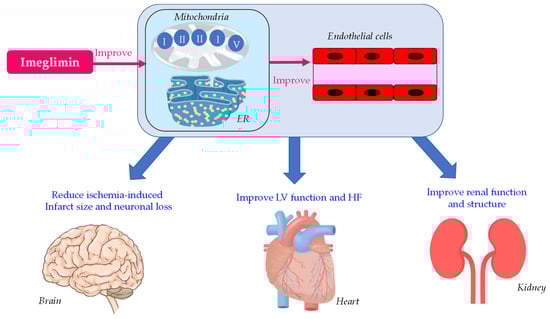 Summary of effects of imeglimin on endothelial function, heart, kidney and brain. ER, endoplasmic reticulum; HF, heart failure; LV, left ventricle.